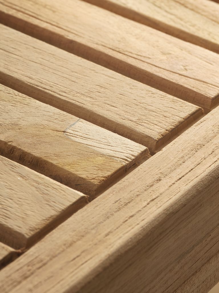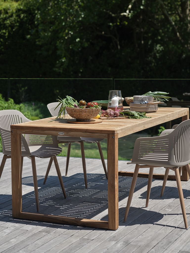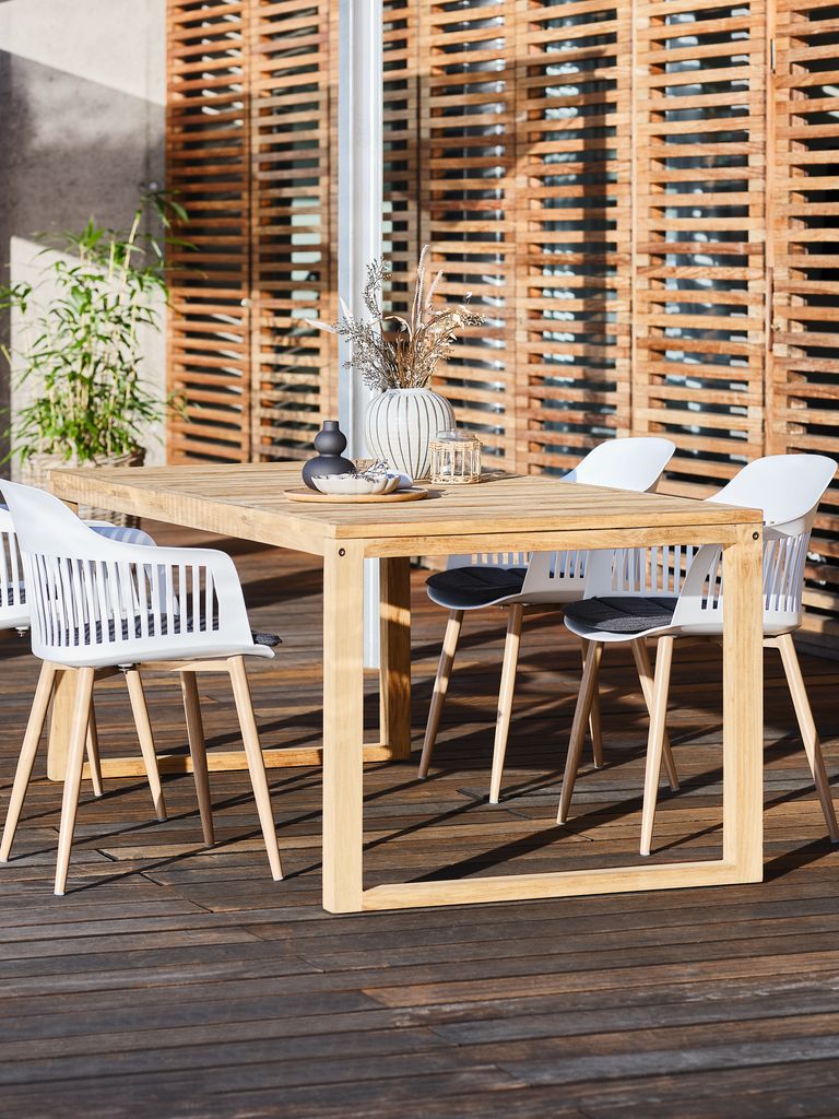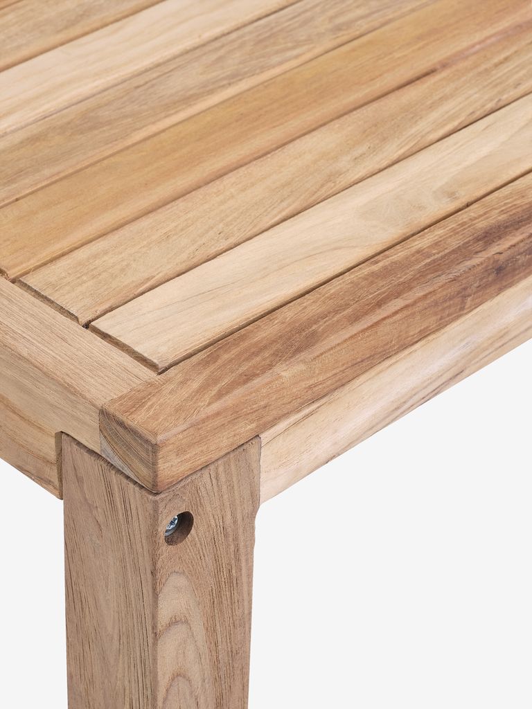Geri dönüştürülmüş masif FSC® tikten masa üstüne sahip bahçe masası. Tik, nemin ahşaba emilmesini engelleyen yüksek oranda doğal yağ içeren, hoş bir görüntüye sahip ve dayanıklı bir sert ağaç türüdür. Zamanla tik, gümüş-gri bir yüzey geliştirir. G90 x U196 x Y75 cm