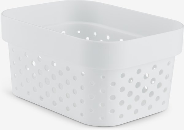1,4 litrelik beyaz sepet, pratik ve delikli bir tasarıma sahiptir. Çeşitli küçük eşyaları saklamak için idealdir. Sepet, temizlemesi kolay plastikten (%100 geri dönüştürülmüş) yapılmıştır. G13 x U17 x Y8 cm